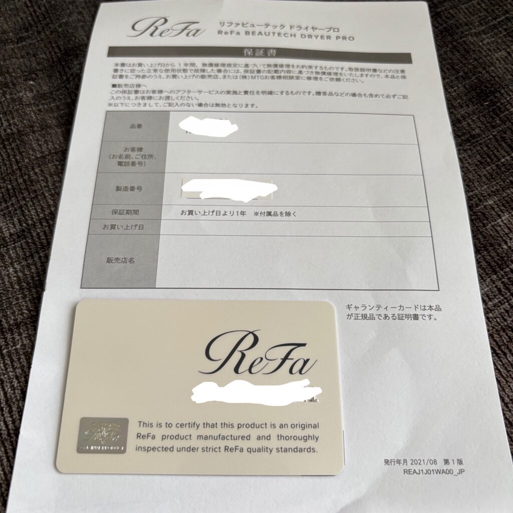 リファは正規品を購入すると保証書と一緒にギャランティカードが付いてきます。